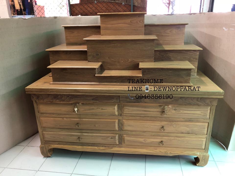 แท่นพระ ,โต๊ะหมู่บูชา ทำจากไม้สักเก่าทำสีด้วยสีเผือกให้ใกล้เคียงกับเนื้อไม้เดิมที่สุด ขนาด 80*150*125 เซนติเมตร มี 6 ลิ้นชักติดด้วยมือจับทองเหลือง ด้านบนมีสองถาดวางของ ราคาข้างต้นยังไม่รวมค่าจัดส่ง จัดส่งกรุงเทะและข้างเคียง 2000-2500 บาท
