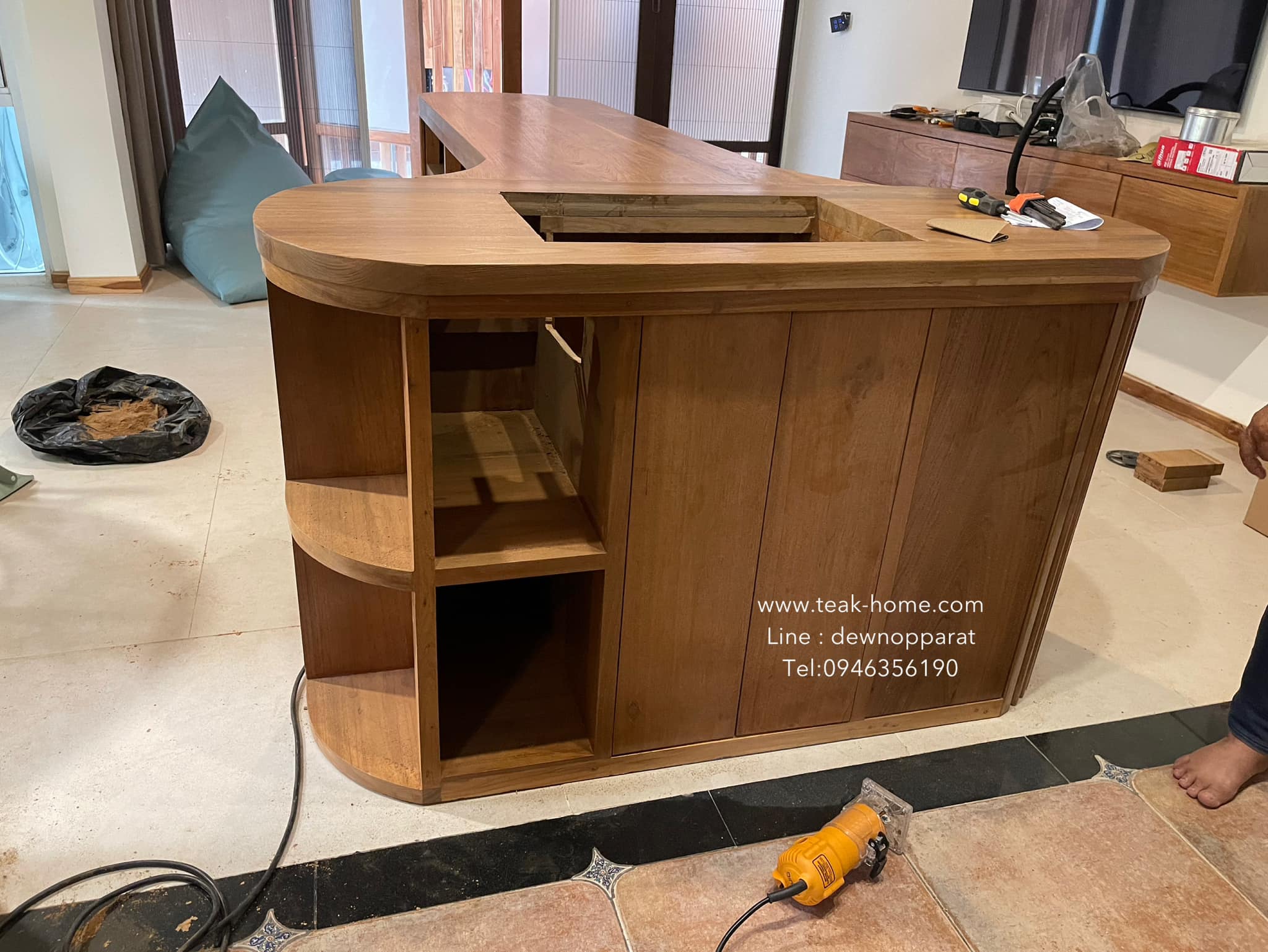 โต๊ะรับประทานอาหารกึ่งตู้ครัวรูปทรงตัวทีทำจากไม้สักเก่า ทำสีด้วยสีธรรมชาติ ตัวโต๊ะเจาะช่องสำหรับวางอ่างซิงค์ล้างจาน ตัวท็อปโต๊ะใช้ไม้หนา 3 cm ในการทำ ขนาดของตู้อยู่ในรูปสุดท้ายนะคะ
