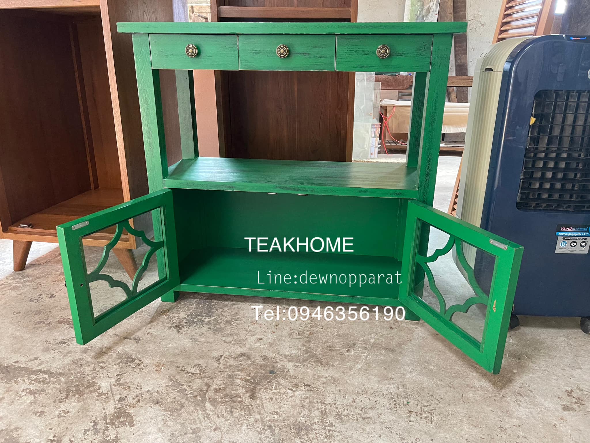 ตู้วางของขนาด 40*120 ความสูง 90 เซนติเมตร ตัวตู้ทำจากไม้สักเก่าทำสีด้วยสีเขียวและมีการขัดตกแต่งลาย